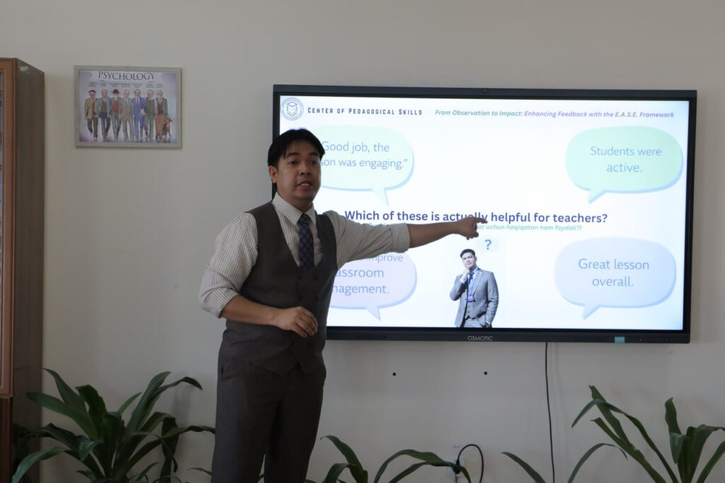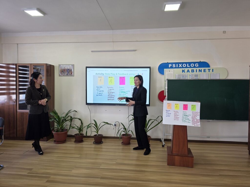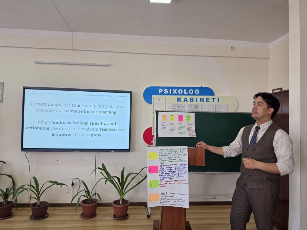 Qaraqalpaqstan Respublikası Pedagogikalıq sheberlik orayında metodistler ushın xalıqaralıq ekspert Albert De La Peña qatnasıwında “Baqlawdan tásirge shekem: E.A.S.E. arqalı pikir-usınıslardı kúsheytiw” temasında ámeliy seminar ótkerilmekte. Seminardıń maqseti: Metodistlerdiń kásiplik potencialın arttırıw, olardıń baqlaw tiykarında nátiyjeli hám sistemalı pikir-usınıs beriw kónlikpelerin rawajlandırıw. Seminar dawamında qatnasıwshılarǵa E.A.S.E. (Evidence-Action-Support-Engagement) modeli tiykarında dálillerge tiykarlanǵan hám anıq háreketlerge baǵdarlanǵan pikir-usınıslardı qáliplestiriw usılları túsindirildi. _