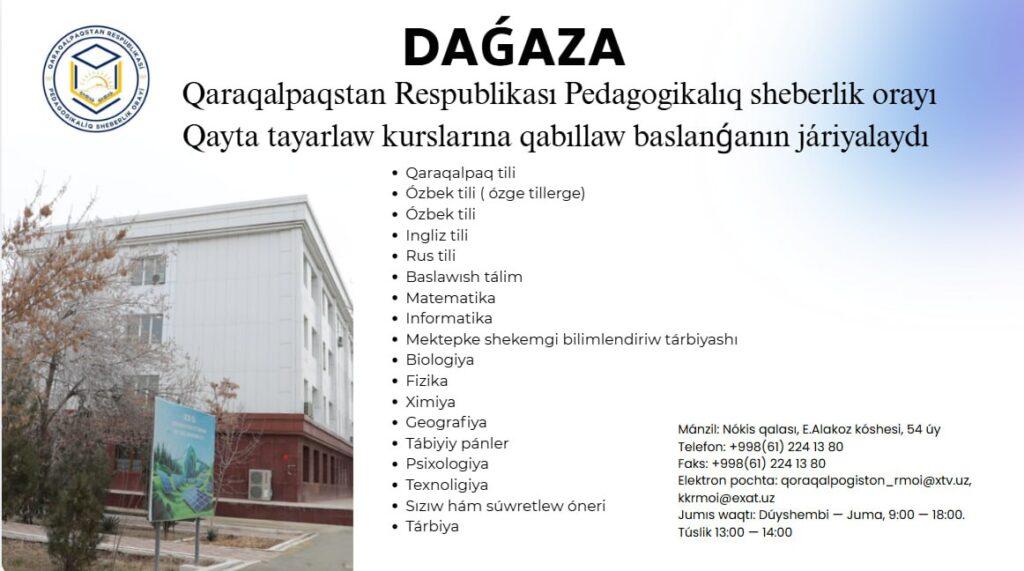 🎓Qaraqalpaqstan Respublikası Pedagogikalıq sheberlik orayı sizdi qayta tayarlaw kurslarına mirát etedi!