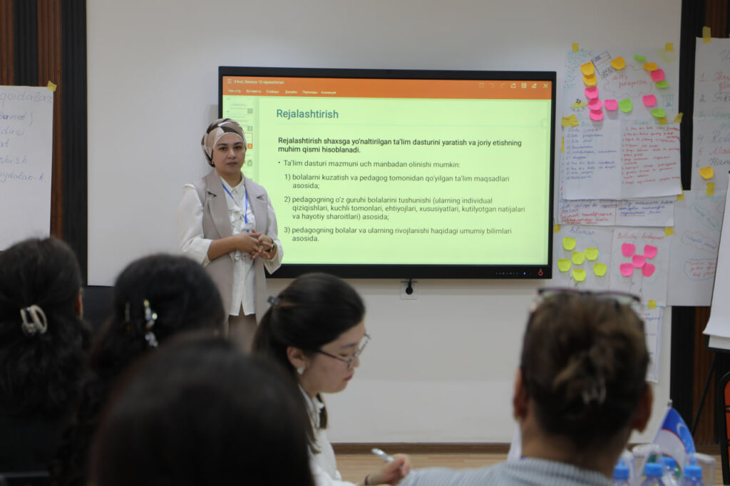 2026-jıl 22-aprel kúni Pedagogikalıq sheberlik orayında “Ilk qadam” mámleketlik oqıw baǵdarlamasın ámeliyatqa engiziw boyınsha qısqa múddetli oqıw kurslarınıń ekinshi basqıshı dawam etpekte. Bul oqıw kursları Ózbekstan Respublikası Mektepke shekemgi hám mektep bilimlendiriwi ministrliginiń baslaması menen hám de xalıqaralıq shólkemler — UNICEF, Islam rawajlanıw banki (IsDB), Arab muwapıqlastırıwshı toparı (ACG) hám Bilimlendiriw boyınsha global sheriklik (GPE) qollap-quwatlawı menen ámelge asırılmaqta. Oqıw barısında qatnasıwshılar ushın tómendegi baǵdarlar boyınsha teoriyalıq hám ámeliy shınıǵıwlar shólkemlestirilmekte: – «Ilk qadam» baǵdarlaması tiykarında bilimlendiriwdi rejelestiriw; – Inklyuziya hám hár túrlilikke kirispe; – shańaraqlar menen nátiyjeli sheriklikti jolǵa qoyıw hám ata-analardı bilimlendiriw processine tartıw. Treninglerdiń tiykarǵı maqseti: – mektepke shekemgi bilimlendiriw sapasın arttırıw; – pedagoglardıń kásiplik potencialın rawajlandırıw; – “Ilk qadam” baǵdarlamasın nátiyjeli engiziw;