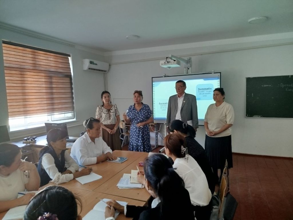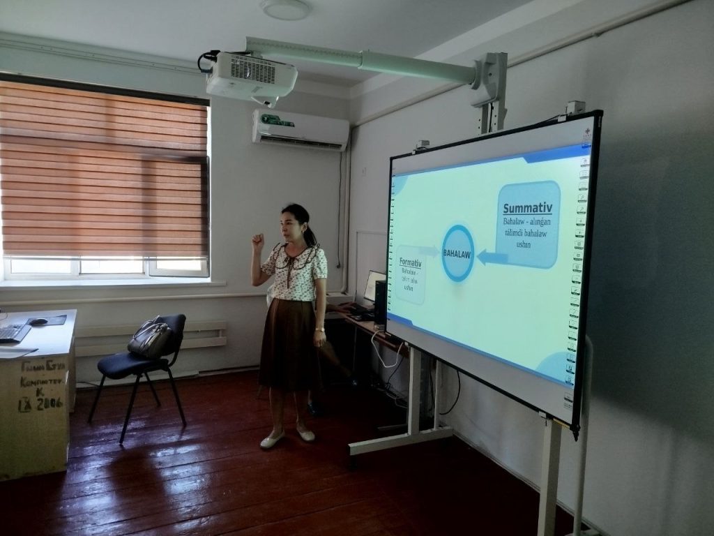 Seminar-trening dawamında “Kriteriyalarǵa tiykarlanǵan jaña bahalaw sisteması” nıń maqseti hám mazmunı túsindirildi. Formativ bahalaw, summativ bahalaw hám e.maktab.uz elektron platformasında qay tárizde jumıs islew haqqında mağlıwmatlar berildi.