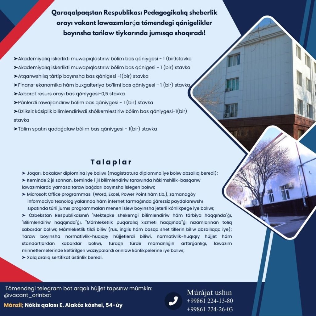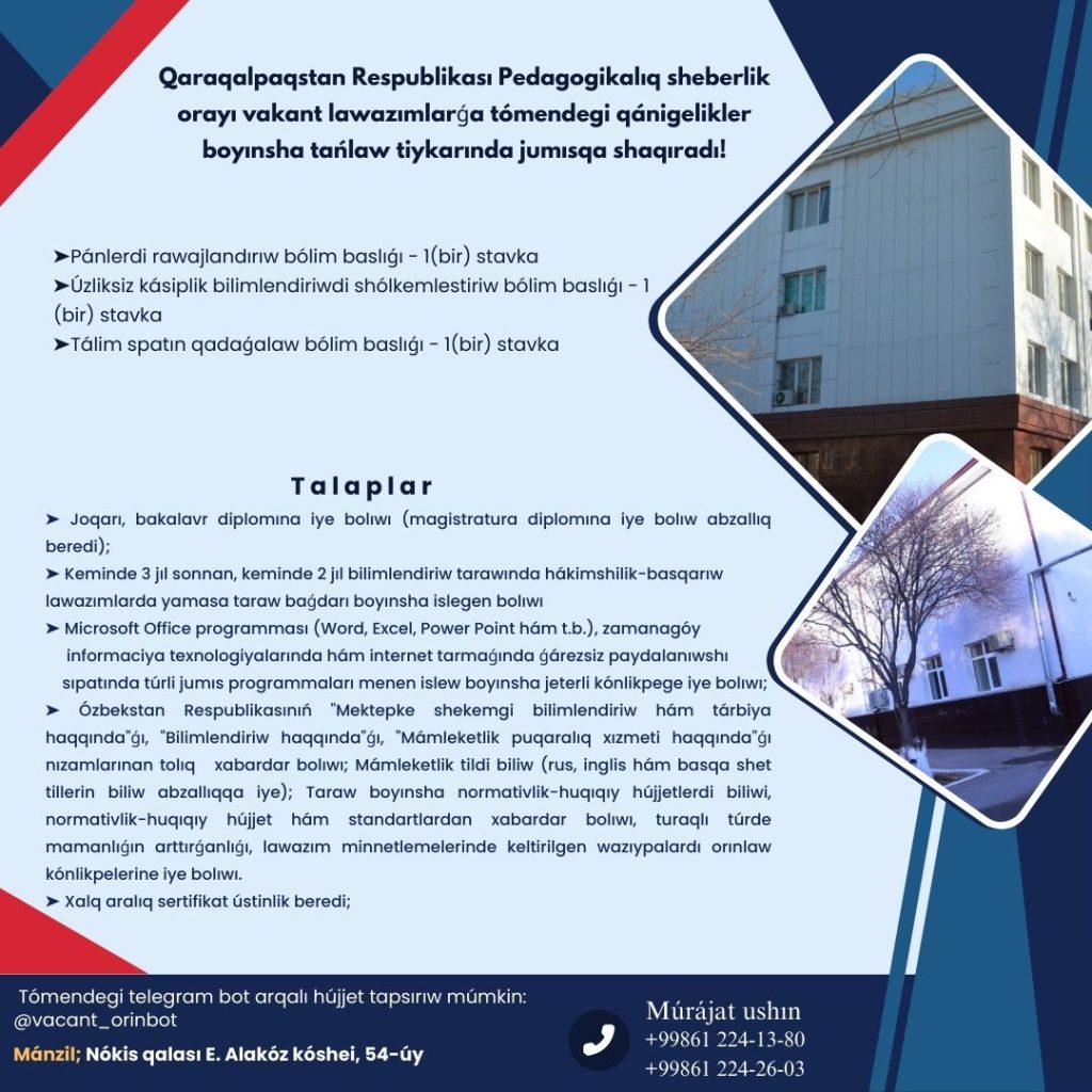 Qaraqalpaqstan Respublikası Pedagogikalıq sheberlik orayı tómendegi qánigelikler boyınsha tańlaw tiykarında jumısqa shaqıradı!
