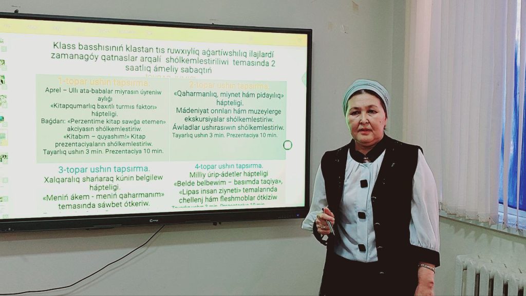 “Baslawısh, mektepke shekemgi hám arnawlı tálim metodikaları” kafedrası docenti G.Yusupova tárepinen baslawısh tálim 1-topar kurs tıńlawshıları ushın «Klass basshisiniń klastan tis ruwxiy-aǵartíwshiliq ilajlardi zamanagóy qatnaslar arqali shólkemlestiriw» atamasında ashıq sabaq ótkerildi.