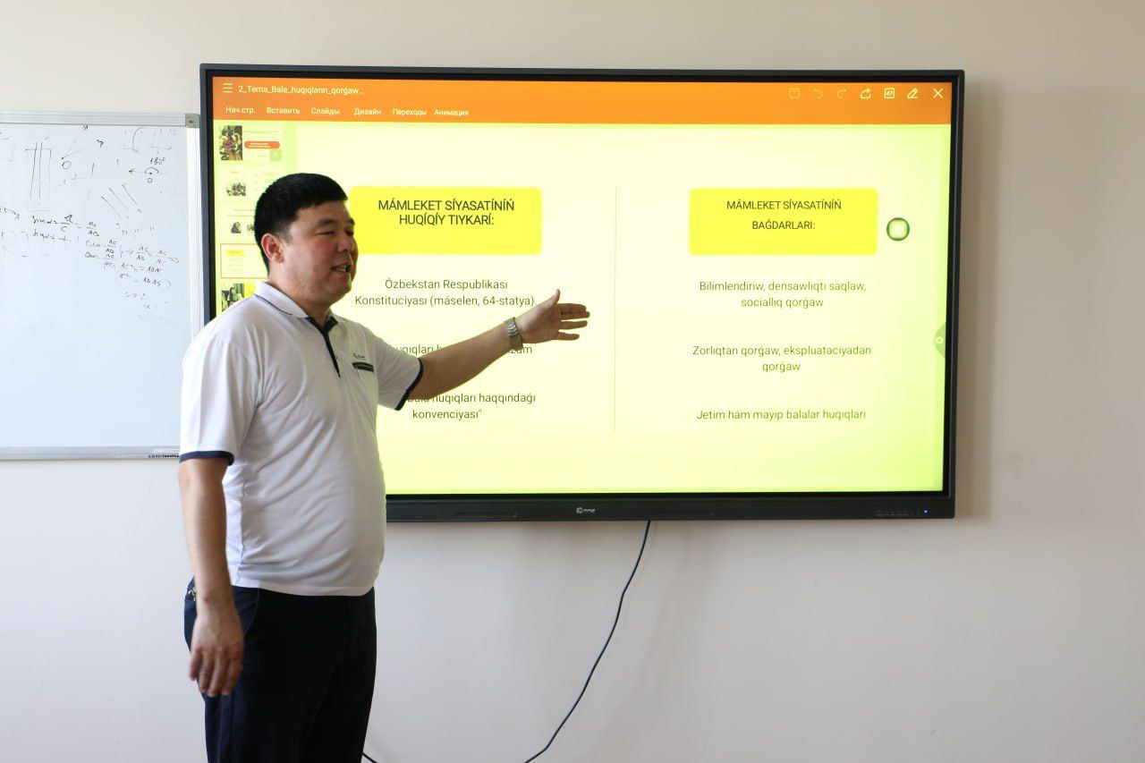 Sabaq dawamında Ózbekstanda bala huqıqların támiyinlewge qaratılǵan mámleketlik siyasattıń tiykarǵı baǵdarları, milliy hám xalıqaralıq huqıqıy tiykarlar, sonday-aq, bul baǵdarda pedagoglardıń roli kórsetip ótildi.