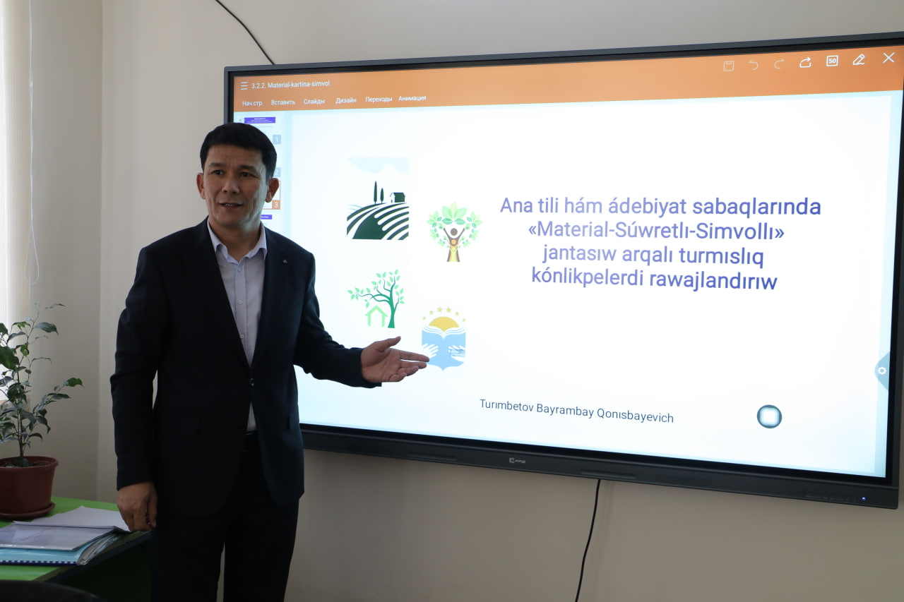 Qaraqalpaqstan Respublikası Pedagogikalıq sheberlik orayında Tillerdi oqıtıw metodikası kafedrası docenti Bayrambay Turımbetov tárepinen úzliksiz kásiplik rawajlanıw “Qaraqalpaq tili adebiyatı” kursında «Ana tili hám ádebiyat sabaqlarında «Material-Súwretli-Simvollı» jantasıw arqalı turmıslıq kónlikpelerin rawajlandırıw» temasında ashıq sabaq ótildi.