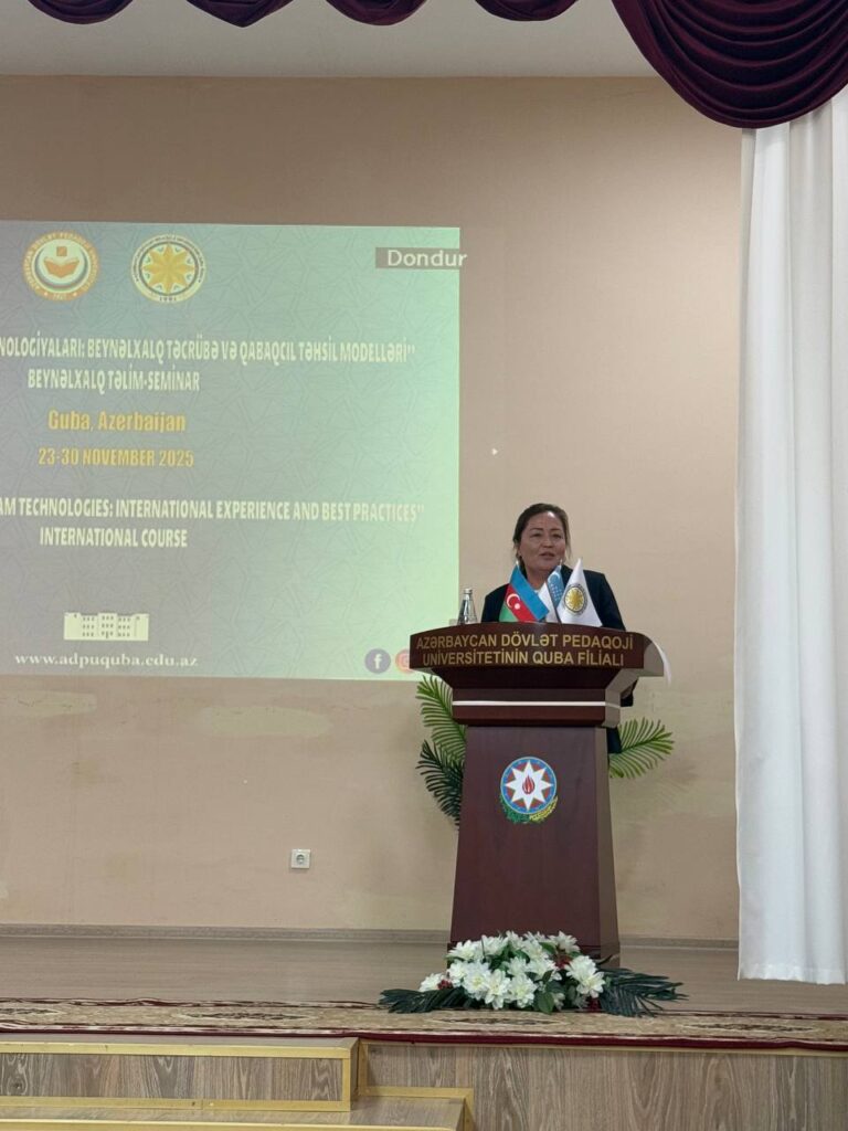Ózbekstan hám Ázerbayjan arasındaǵı bilimlendiriw tarawındaǵı birge islesiwdi bekkemlew maqsetinde, 2025-jıl 23-30-noyabr kúnleri Ázerbayjan Mámleketlik pedagogikalıq universiteti Guba filialında “Inklyuziv tálim hám STEAM texnologiyaları: xalıqaralıq tájiriybe hám aldınǵı bilimlendiriw modelleri” temasında xalıqaralıq tájiriybe arttırıw kursları shólkemlestirildi. Bul xalıqaralıq oqıw baǵdarlamasında Qaraqalpaqstan Respublikası Pedagogikalıq sheberlik orayınıń professor-oqıtıwshıları – Anıq hám tábiyıy pánler metodikası kafedrasınıń aǵa oqıtıwshıları Gulxan Jiemuratova hám Dilfuza Kutlımuratovalar belsene qatnaspaqta.