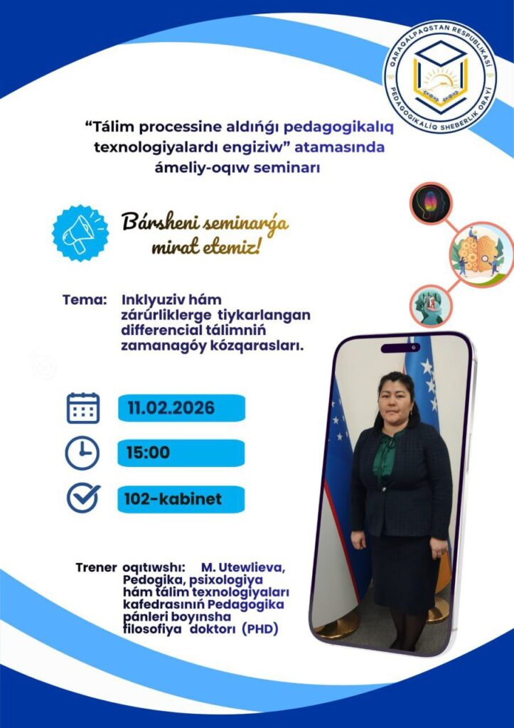 04.02.2026 Tálim processinde aldıńǵı pedagogikalıq texnologiyalardı engiziw atamasında ámeliy-oqıw seminar