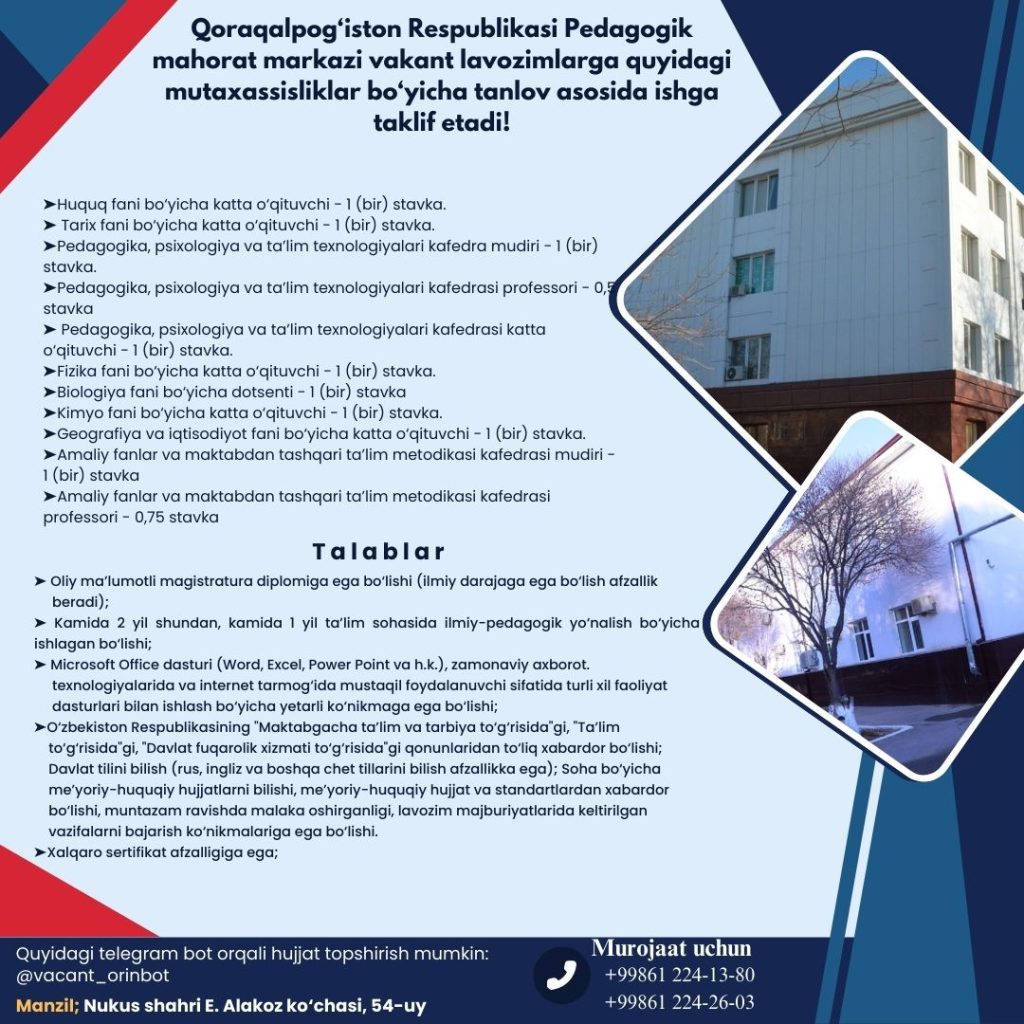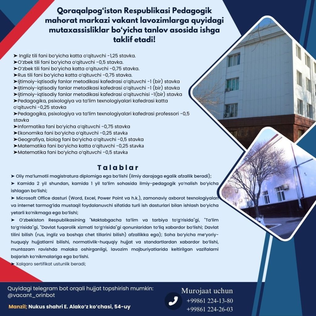 QR Pedagogik mahorat markazi quyidagi mutaxassisliklar bo’yicha tanlov asosida ishga taklif qiladi
