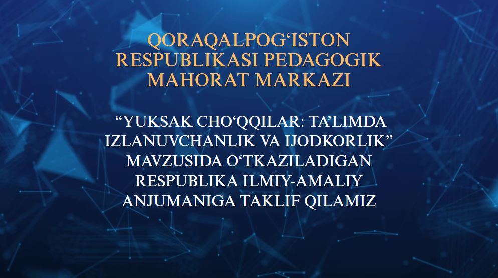 Nukus shahridagi Pedagogik mahorat markazi 2025-yil 16-may kuni “Yuksak cho‘qqilar: ta’limda izlanuvchanlik va ijodkorlik” mavzusida respublika ilmiy-amaliy anjuman tashkil etilishini ma’lum qilgan holda unda ishtirok etishga taklif qiladi.