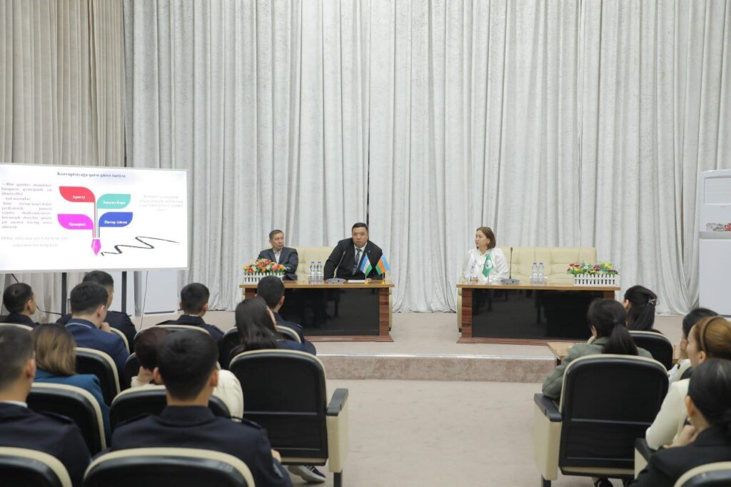 Uchrashuv davomida korrupsiyaning xavf-xatarlari, uning oldini olishga doir qonunchilik talablari, shuningdek yoshlar orasida “halollik madaniyati”ni shakllantirishning ahamiyati haqida batafsil ma’lumotlar berildi.