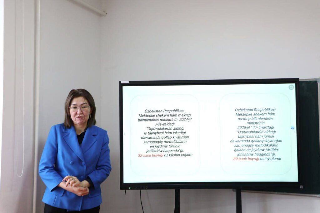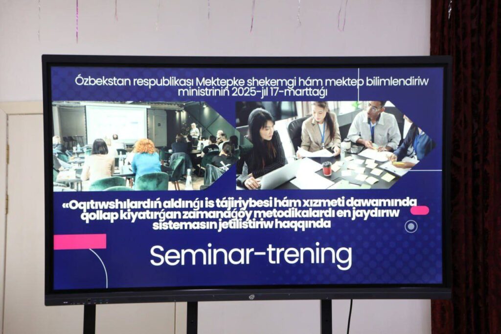 O‘zbekiston Respublikasi Maktabgacha va maktab ta’limi vazirligining 2025-yil 17-martdagi 89-sonli buyrug‘i ijrosi doirasida “O‘qituvchilarning oldingi ish tajribasi hamda xizmat davomida qo‘llab kelinayotgan zamonaviy metodikalarni joriy etish tizimini takomillashtirish” mavzusida Qoʻng‘irot tumani 41-sonli umumta’lim maktabida seminar-trening tashkil etildi.