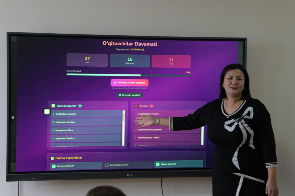 Informatika va axborot texnologiyalari fani o‘qituvchilari uchun tashkil etilgan malaka oshirish kurslari doirasida mashg‘ulotlar loyihaga asoslangan ta’lim (Project-Based Learning) yondashuvi asosida olib borilmoqda. Kurs tinglovchilariga ikki haftaga mo‘ljallangan amaliy loyiha topshirig‘i berildi. Loyiha mavzusi — o‘quvchilarning darsga qatnashishini nazorat qilish uchun mobil yoki veb-ilova yaratish. Mazkur loyiha jarayonida tinglovchilar quyidagi muhim kasbiy kompetensiyalarni rivojlantirdilar: dasturiy yechimlarni loyihalash va ishlab chiqish; raqamli texnologiyalarni ta’lim jarayoniga samarali joriy etish; jamoada ishlash va vazifalarni taqsimlash; real muammoni hal etishga qaratilgan amaliy ilovalar yaratish. Bugun loyiha ishlari taqdimoti bo‘lib o‘tdi. Unda 5 ta guruh tomonidan ishlab chiqilgan ilovalar namoyish etilib, ularning funksionalligi, qulayligi va ta’lim jarayonida qo‘llash imkoniyatlari atroflicha muhokama qilindi. Darslar Pedagogik mahorat markazining o‘qituvchisi Dilfuza Kutlimuratova tomonidan olib borildi. Mashg‘ulotlar jarayonida tinglovchilarga loyihaga asoslangan ta’limning mazmuni, uni informatika va IT fanlarini o‘qitishda qo‘llash usullari hamda amaliy loyihalarni samarali tashkil etish bo‘yicha metodik tavsiyalar berildi.