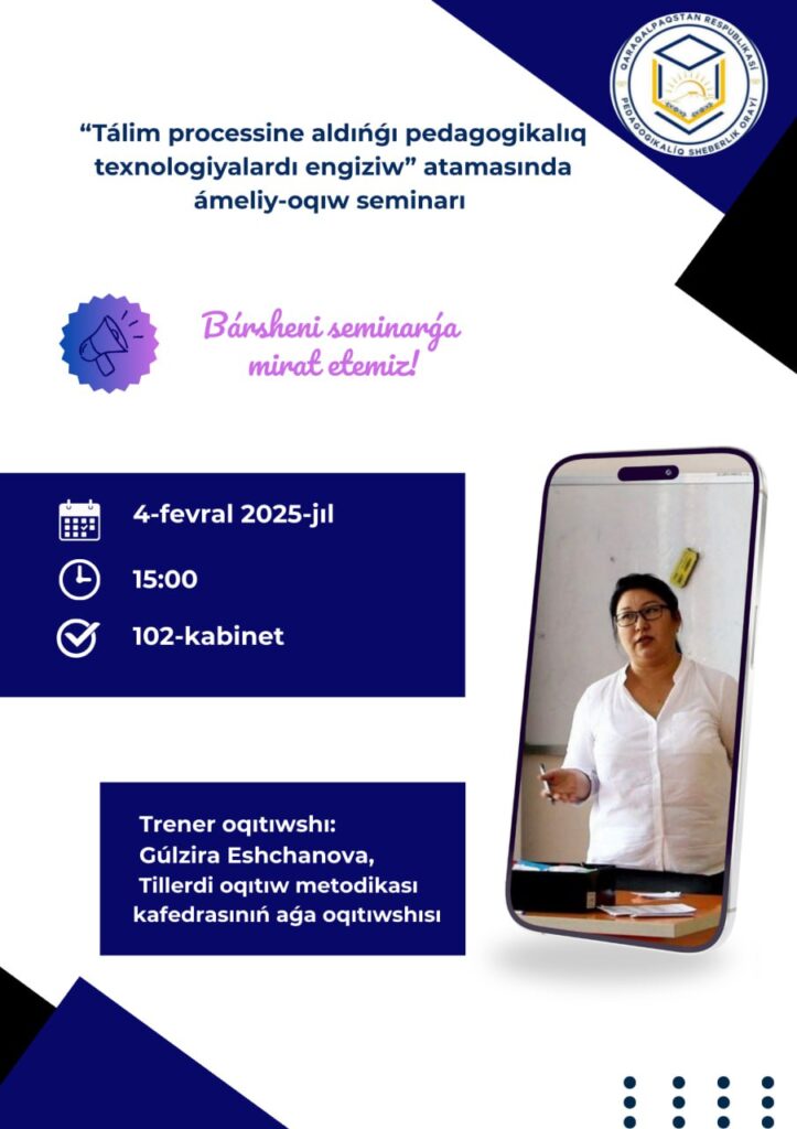 04.02.2026 09:10:59 5 Баспаға шығарыў Ta’lim jarayonida ilg‘or pedagogik texnologiyalarni joriy etish mavzusida amaliy-o‘quv seminar